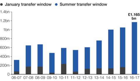 This graphic below illustrates the gradual increase in spending by Premier League clubs over the past 10 January and summer transfer windows.